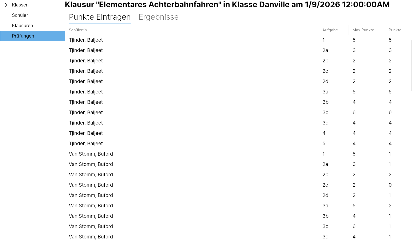 Ich war einige Jahre Dozent an einer Fachhochschule und meine Frau ist Lehrerin. Dabei hantiert man naturgemäß viel mit Klausuren und Noten. Im Laufe der Jahre sind dabei einige Excel-Dokumente entstanden, aber es war immer fummelig den Stand einzelner Schüler über die Jahre zu verfolgen. Dieses eher rudimentäre Programm liefert eine Benutzerschnittstelle zur Erfassung von Noten über eine SQLite-Datenbank. Die Auswertung erfolgt (noch) über manuelle SQL-Abfragen. Der Quelltext ist auf Github verfügbar.